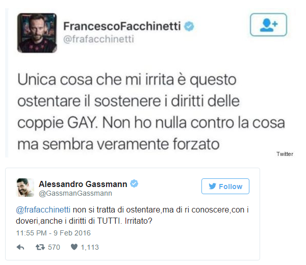 Primo tra tutti, il vulcanico e sempre prolifico account di Maurizio Gasparri, che anche stavolta non perde occasione per polemizzare, puntando il dito niente meno che contro i Pooh, ospiti della terza sera: “Pure i Pooh scappati dall’ospizio diventano conformisti, ora a nanna con la badante”, cinguetta, scatenando la premurosa ira del figlio del tastierista Roby, Francesco Facchinetti, che ribatte: “a te neanche la badante ti sopporta”. L’ex Dj Francesco, dal canto suo, è finito però nel mirino di un’altra querelle, assimilabile all’affollatissimo quanto curioso filone dell’ “ho twittato a mia insaputa”: dopo aver cinguettato in maniera un po’ dura contro “l’ostentazione”, a suo dire “forzata”, dei nastrini colorati indossati dai cantanti in gara a sostegno del decreto Cirinnà, Facchinetti si pente e cancella il tweet. Oppure, per dirla con parole sue, si sveglia la mattina seguente e scopre che il pubblico lo accusa di arroganza “per un tweet che non ho mai scritto”, accusando di superficialità un suo ipotetico collaboratore che ne sarebbe l’autore sbadato e non autorizzato. La disattenzione non è però sfuggita ad Alessandro Gassmann, altro prolifico “twittarolo”, che a sua volta scrive: “Non si tratta di ostentare, ma di riconoscere, con i doveri, anche i diritti di TUTTI. Irritato?”. Una volta c’erano gli uffici stampa, che avevano il nobile ed oneroso compito di modulare sapientemente le esternazioni di vip, meno vip e più o meno vip, al fine di restituirne al pubblico un’immagine coerente e sempre smagliante; oggi i crudeli social network non risparmiano ai suddetti scivolone alcuno.