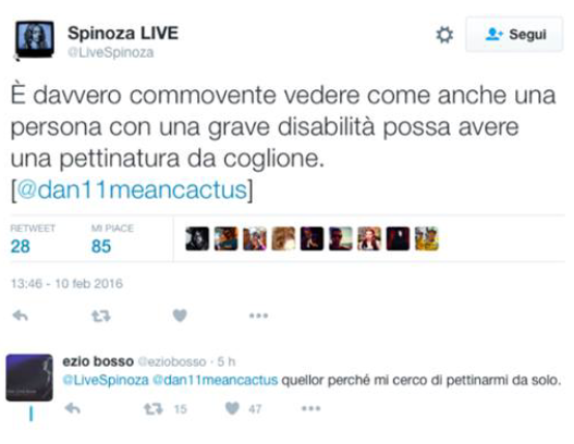 Fuori da veleni e deliri egotici, se l’Ariston riserva la standing ovation più sentita del Festival ad Ezio Bosso, pianista e direttore d’orchestra di fama internazionale esibitosi nella seconda serata, anche i social lo eleggono indiscusso eroe. Al cinguettio del blog satirico Spinoza che aveva definito “da coglione” la capigliatura del maestro affetto da SLA, Bosso ha risposto: ”Quello perché cerco di pettinarmi da solo”. È stata proprio l’autoironia dell’artista, colpito dalla malattia nel 2011, a ricevere il plauso del web. “Era già il nostro idolo prima – scrive Spinoza – ma ora Bosso ha vinto tutto“.