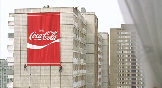 Il protagonista dell’opera, Alex, cerca di nascondere alla mamma Christiane, una comunista ortodossa entrata in coma a poche settimane dalla caduta del muro, l’ingresso della cultura occidentale nell’est del paese. Una delle scene simbolo incalza quando Christiane osserva dall’ospedale un grattacielo dove cala un enorme cartello pubblicitario della Coca Cola; il simbolo del consumismo, del libero commercio senza frontiere è tutto in quel logo dal colore rosso acceso, che ha insieme i connotati della social democrazia e del più sfrenato capitalismo.