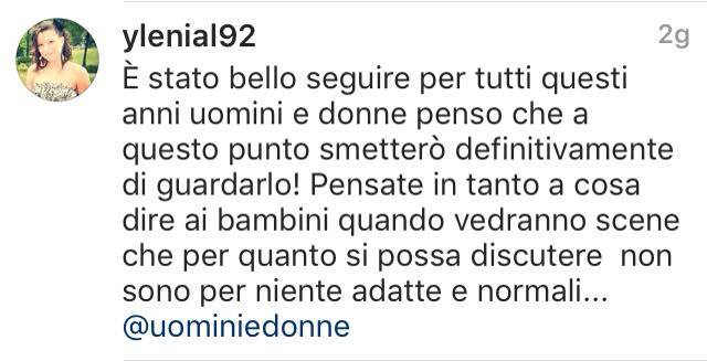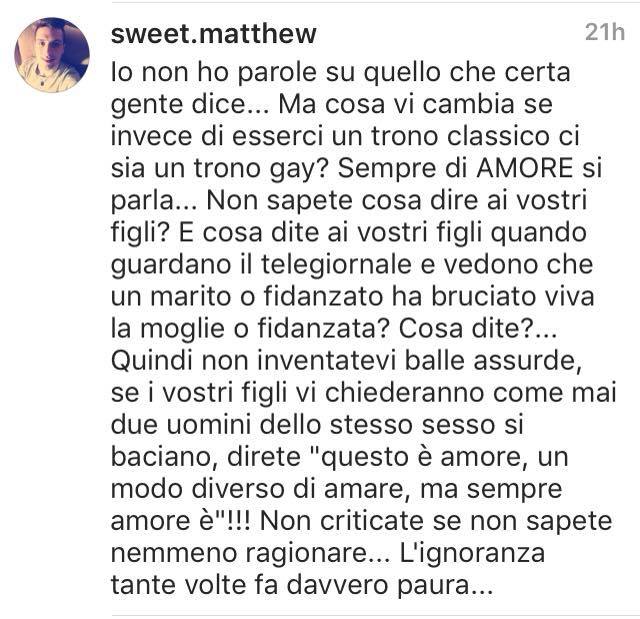 La polemica, come era facile immaginare, non ha tardato ad esplodere, seguendo la scia di quanto avvenuto nei mesi passati: sui social gli utenti si sono divisi, e Instagram ha registrato il maggior numero di commenti – oltre 2200 -, di cui molteplici carichi di sdegno, offese ed insulti. Dal più telegrafico “Che schifo” al velenoso “È stato bello seguire per tutti questi anni Uomini e Donne penso che a questo punto smetterò definitivamente di guardarlo! Pensate intanto a cosa dire ai bambini quanto vedranno scene che per quanto si possa discutere non sono per niente adatte e normali…”, l’omofobia ha dilagato. A distanza di due giorni, il botta e risposta tra chi attacca il trono gay e chi taccia gli utenti intervenuti di essere omofobi e razzisti ancora non si è arrestato, e difficilmente lo farà.
