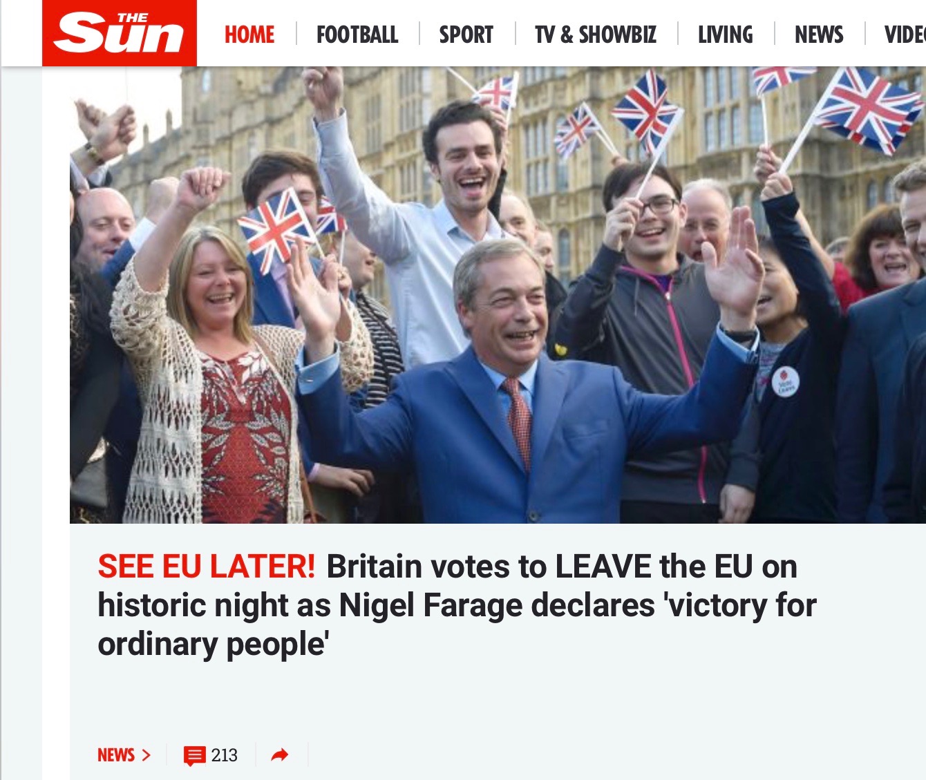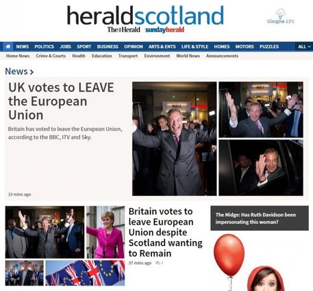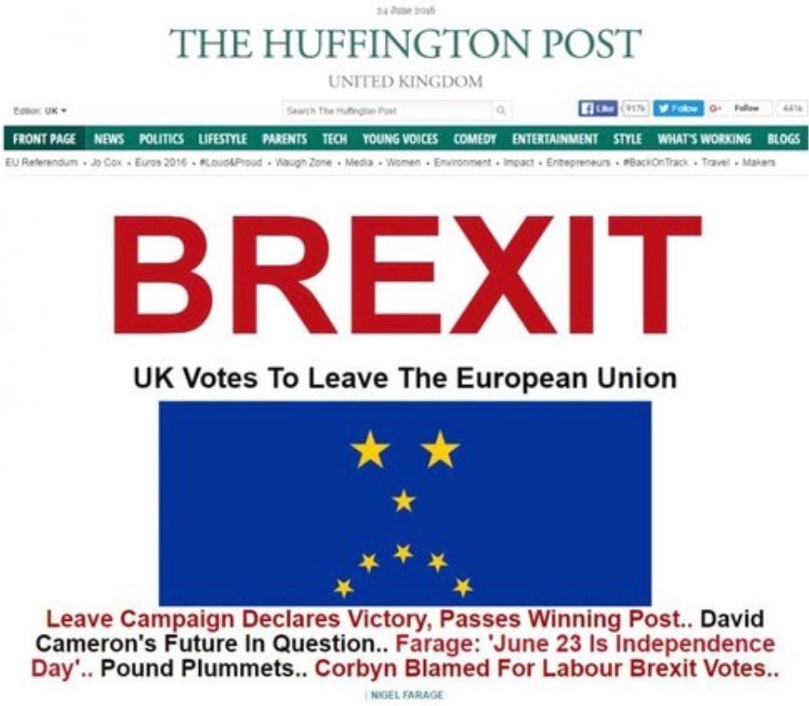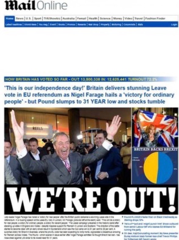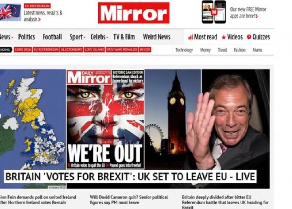 Più sobria la scelta del Daily Mirror, che scrive “Wère Out” (Siamo fuori), pubblicando la foto di un trionfante Nigel Farage, leader del partito euroscettico UKIP. A favore del remain, invece, si era schierato il quotidiano economico finanziario The Financial Times, convinto che “abbandonare la causa di una riforma costruttiva delle UE, che sappiamo essere imperfetta, sarebbe peggio di un autogol”. Il titolo del giorno, come inevitabile, pone quindi il focus sullo shock dei mercati : “UK votes for Brexit in EU referendum, triggering market shockwaves” (UK al voto per la Brexit, si scatena la violenta reazione dei mercati).
