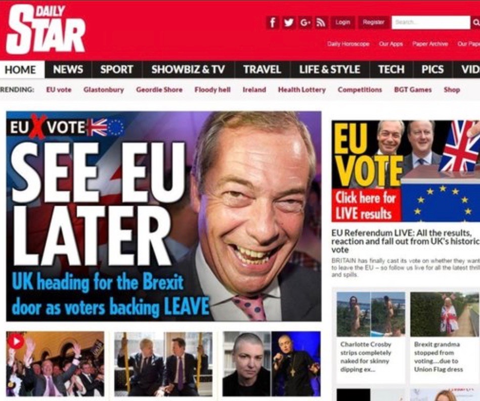 Terremoto Brexit sui giornali inglesi. La vittoria del “leave” domina sulla stampa anglosassone e non, mentre la sterlina cala a picco e per i mercati di tutto il mondo è già un venerdì nerissimo. Alta l’affluenza alle urne: ha votato circa il 72,2% dei cittadini. Hanno pesato molto la questione dell’immigrazione e i sentimenti euroscettici, alimentati da una parte del mondo politico e supportati, negli scorsi mesi, sulle pagine di diversi quotidiani britannici. In prima linea per l’uscita dell’Unione Europea si è schierato il The Sun, il primo tabloid per diffusione che negli scorsi mesi ha presentato la Brexit come la giusta scelta “per liberarci dalla dittatura di Bruxelles”, titolando, all’indomani del voto, “See EU later”. Stesso gioco di parole rilanciato anche dal sito del Daily Star.