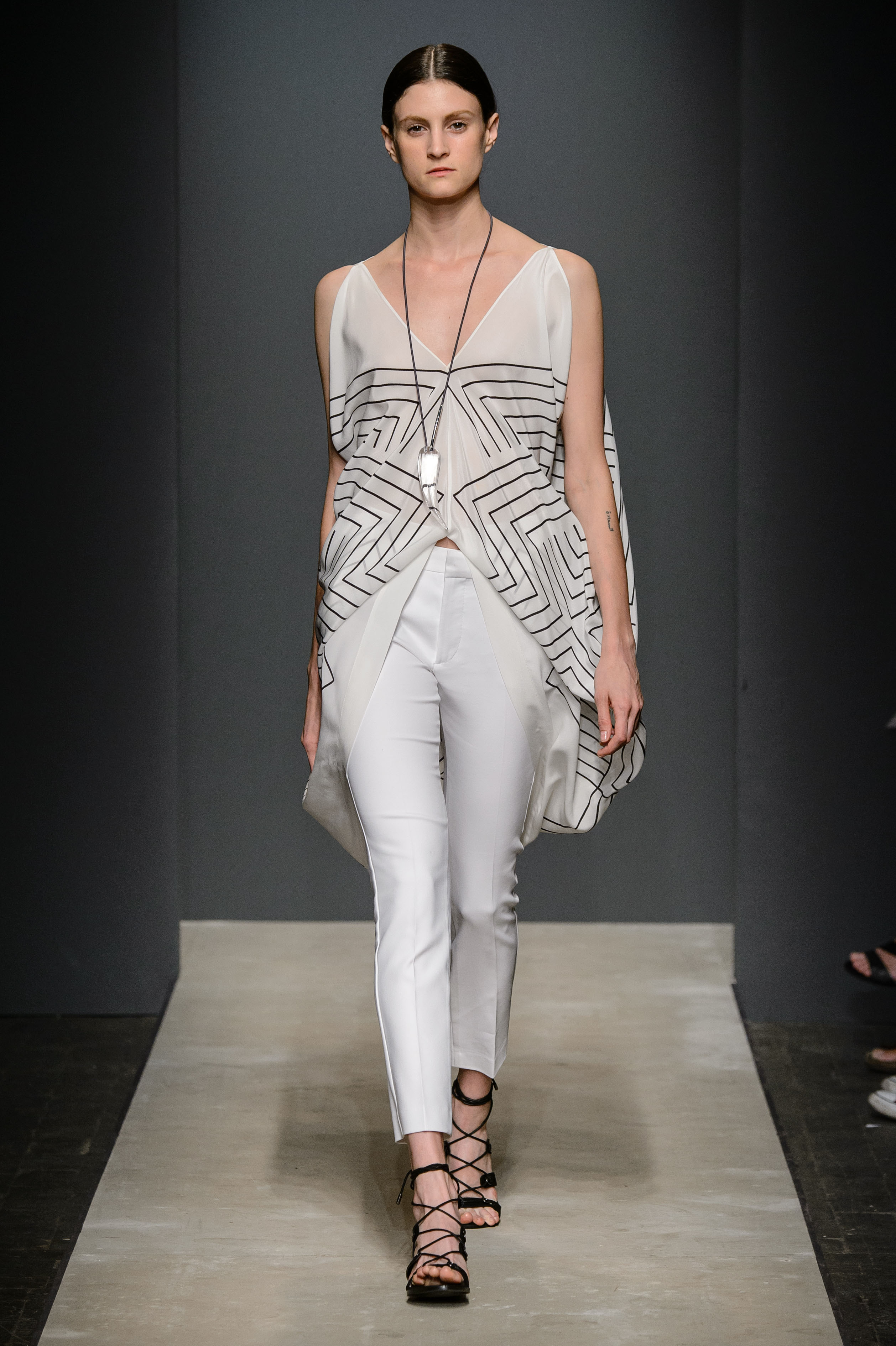 Ed eccoci ai giorni nostri. Precisamente nei meravigliosi giardini del The Church Palace Hotel, su Via Aurelia, dove la nuova collezione Mono Tona | SS 2017 dell’architetto-stilista Sabrina Persechino ci porta ai principi dell’architettura minimalista, nelle linee semplici ed essenziali degli abiti, nei volumi regolari, nella sua povera tavolozza cromatica in cui “una funzione monotòna è una funzione che mantiene l’ordinamento tra insiemi ordinati. Perché analisi spesso si parla di funzioni monotòne crescenti e monòtone decrescenti. E proprio come in un insieme matematico che ha come base rigorosamente il nero.” Si scomoda la matematica ad AltaRoma 2016. Perché anche il fascino della scienza è senza tempo.