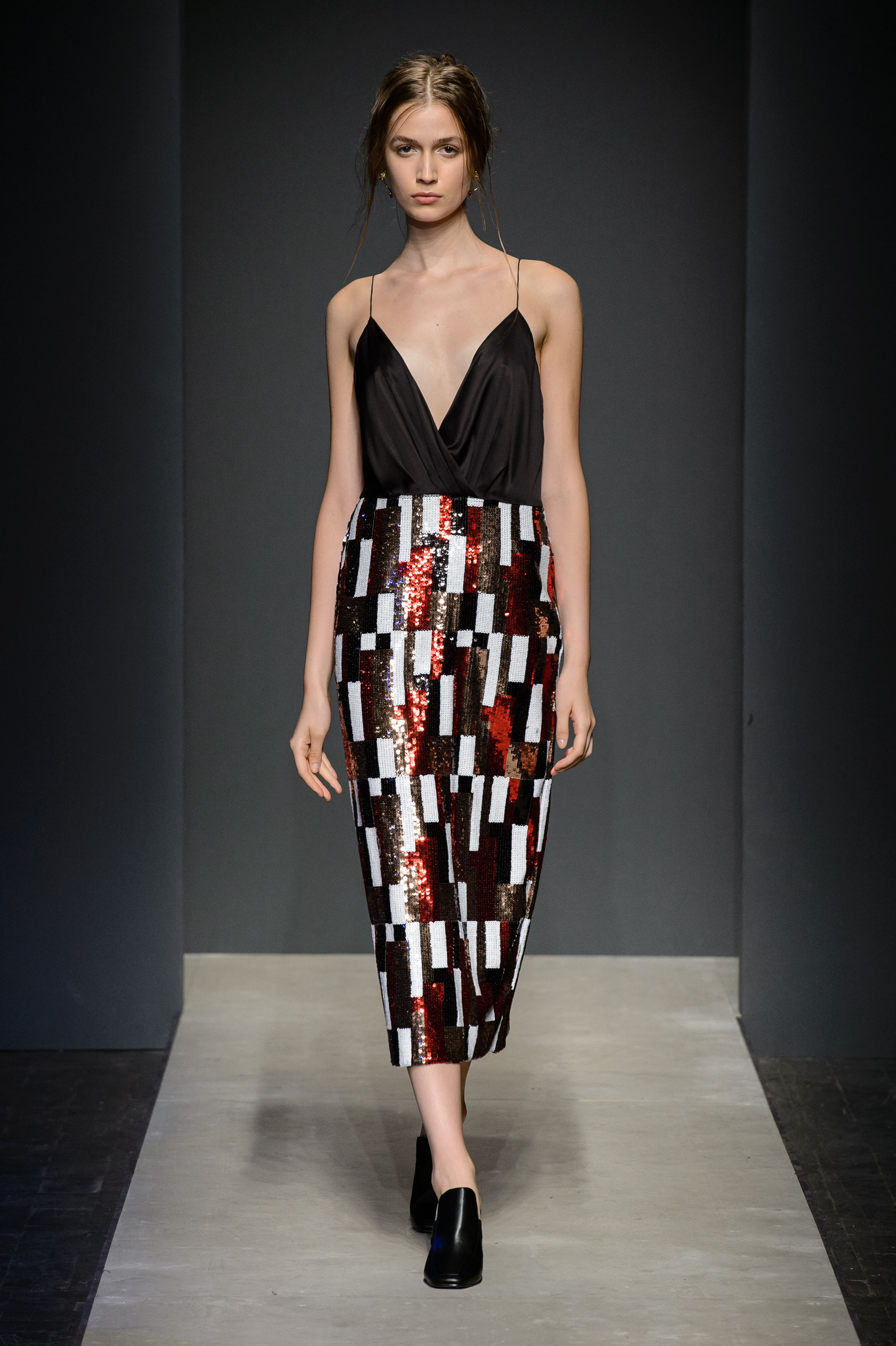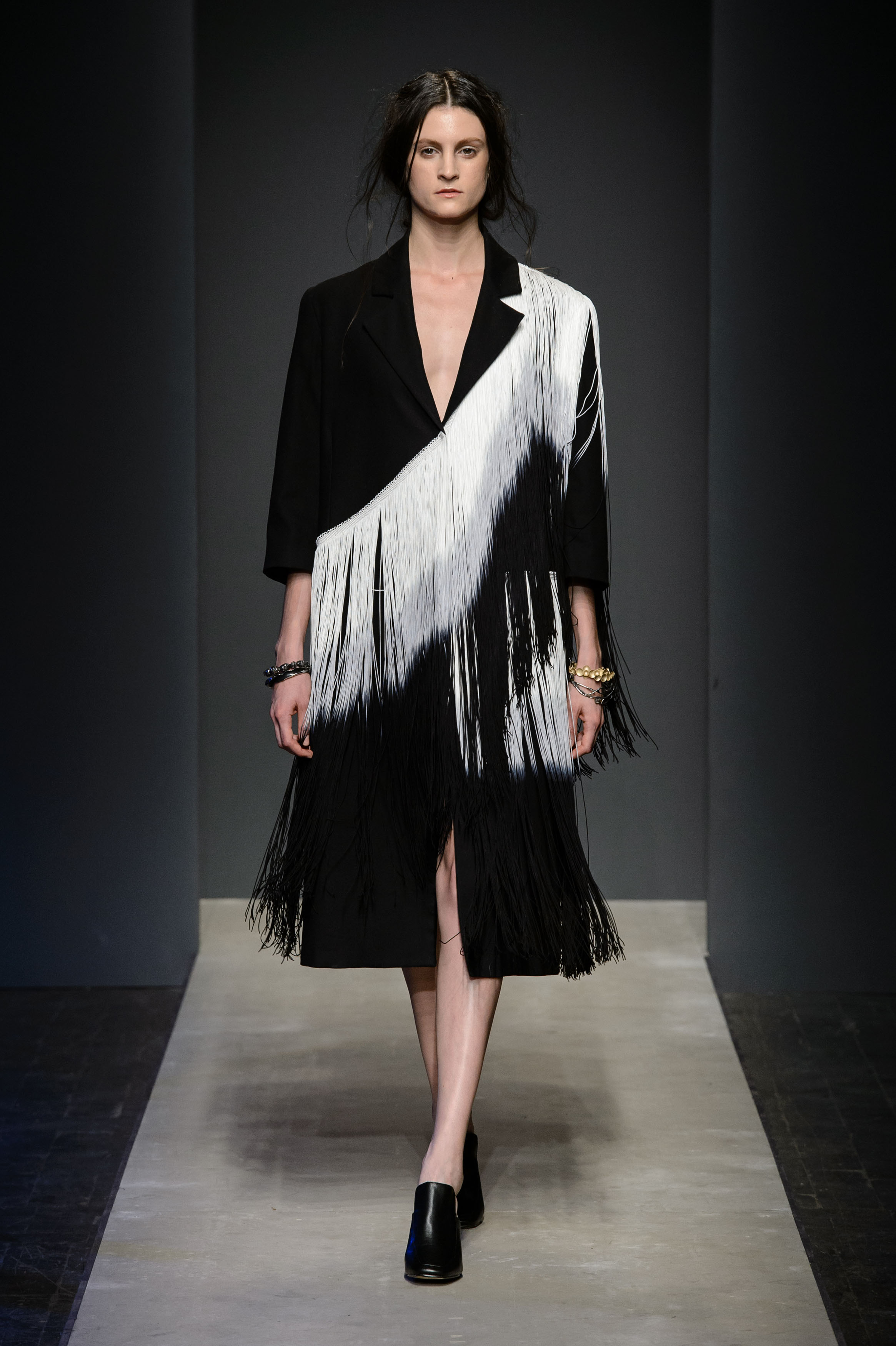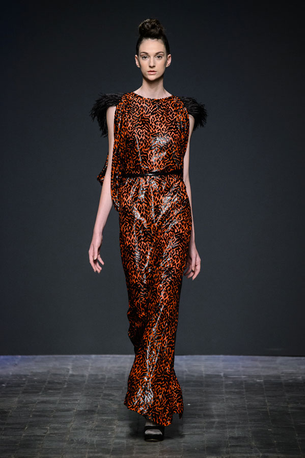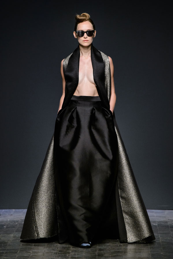 Alle 11 del mattino, in Ex Dogana a San Lorenzo, scomodano anche Anassagora di Clazomene Silvano Arnoldo e Massimiliano Battois, fondatori veneziani del marchio Arnoldo Battois, ed in particolare la sua massima “In principio era il caos, poi arrivò lo spirito che separò e mise in ordine”, manifesto per la Collezione Contrapposizioni SS| 2017. La visione dinamica del filosofo presocratico trova concretizzazione nell’unione tra contrasti e spunti diversi, di linee e volumi opposti, di abbinamenti di tessuti pesanti e leggeri, di assenza di stagionalità, di colori opposti e interventi di eco-pelle. Iconiche peonie richiamano l’Oriente e la cultura giapponesi sovrapponendosi a grafiche geometrie sporty-chic, enfatizzate da luminescenti textures, quali lurex argento, raso satiné nero uniti a broccati e agli altri materiali come organza triple, file-coupé, jacquard di seta, raso satiné, chiffon. Un’ontologia dell’essere che celebra dinamismo, all’insegna di demicouture e contemporaneità.
