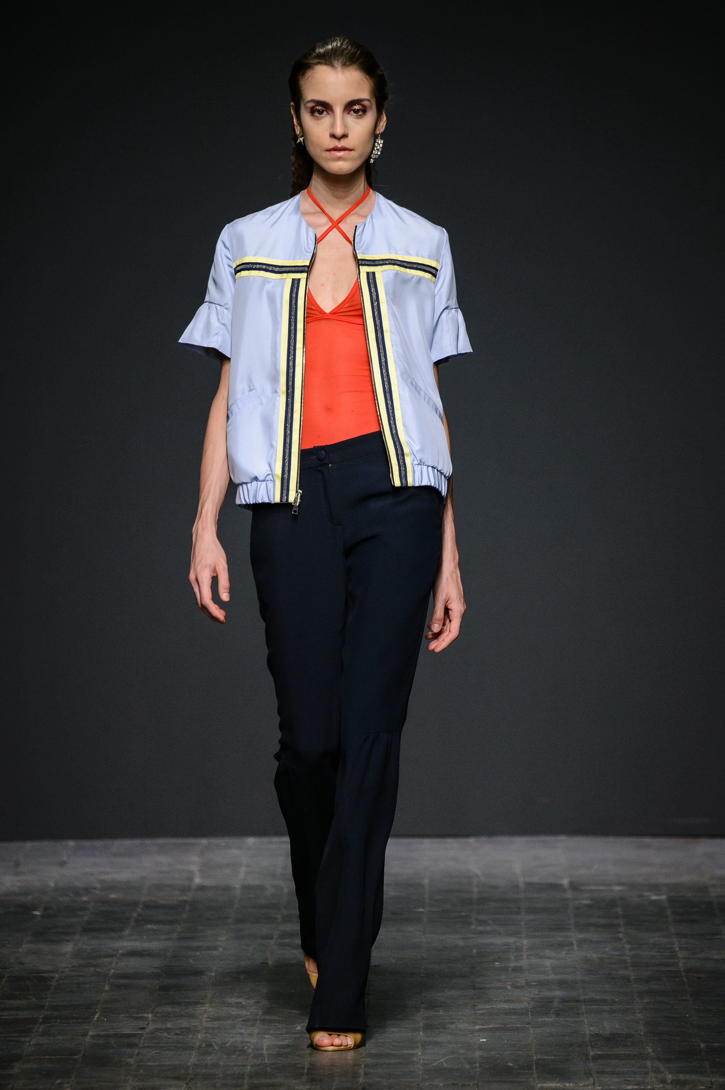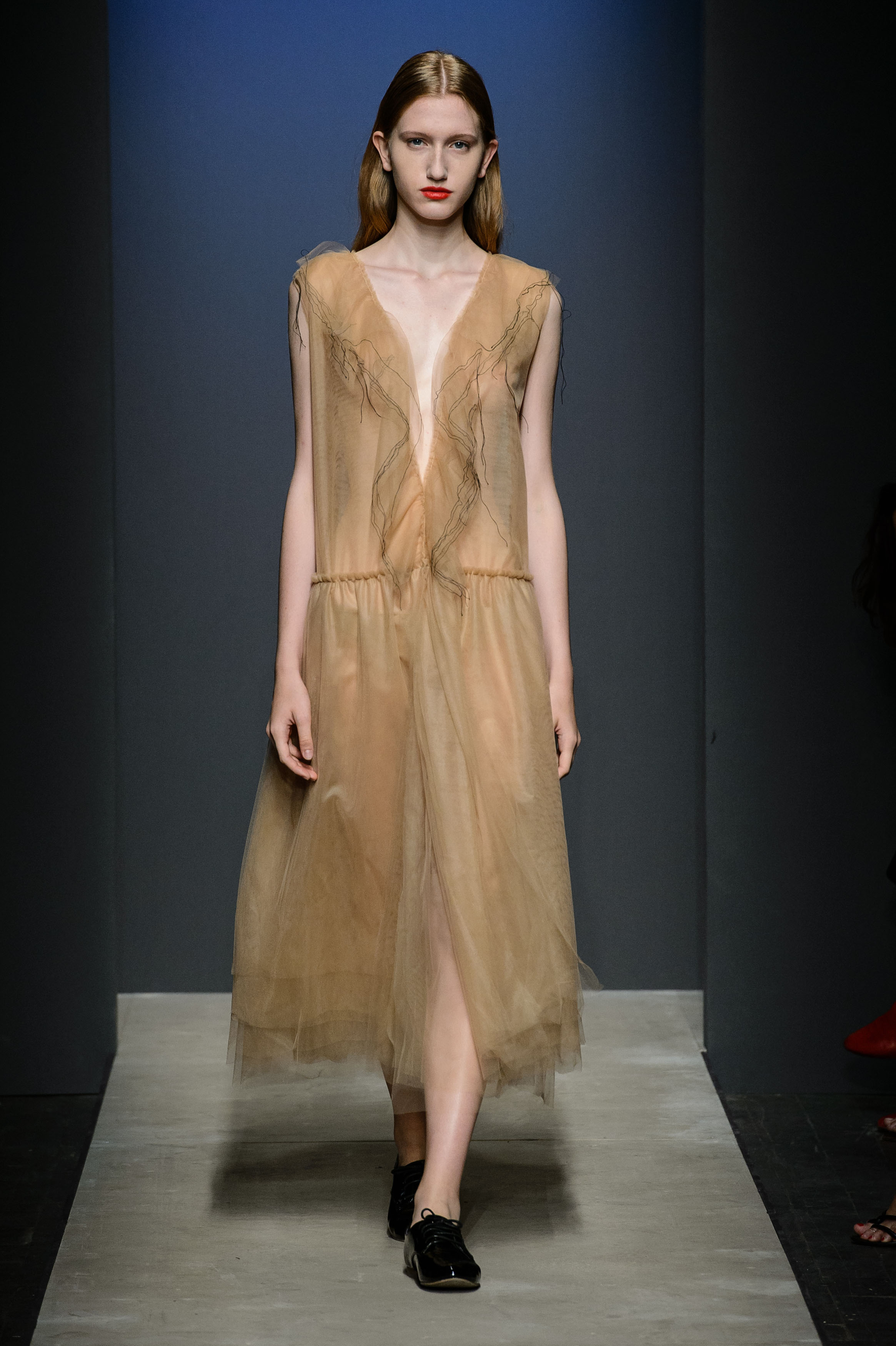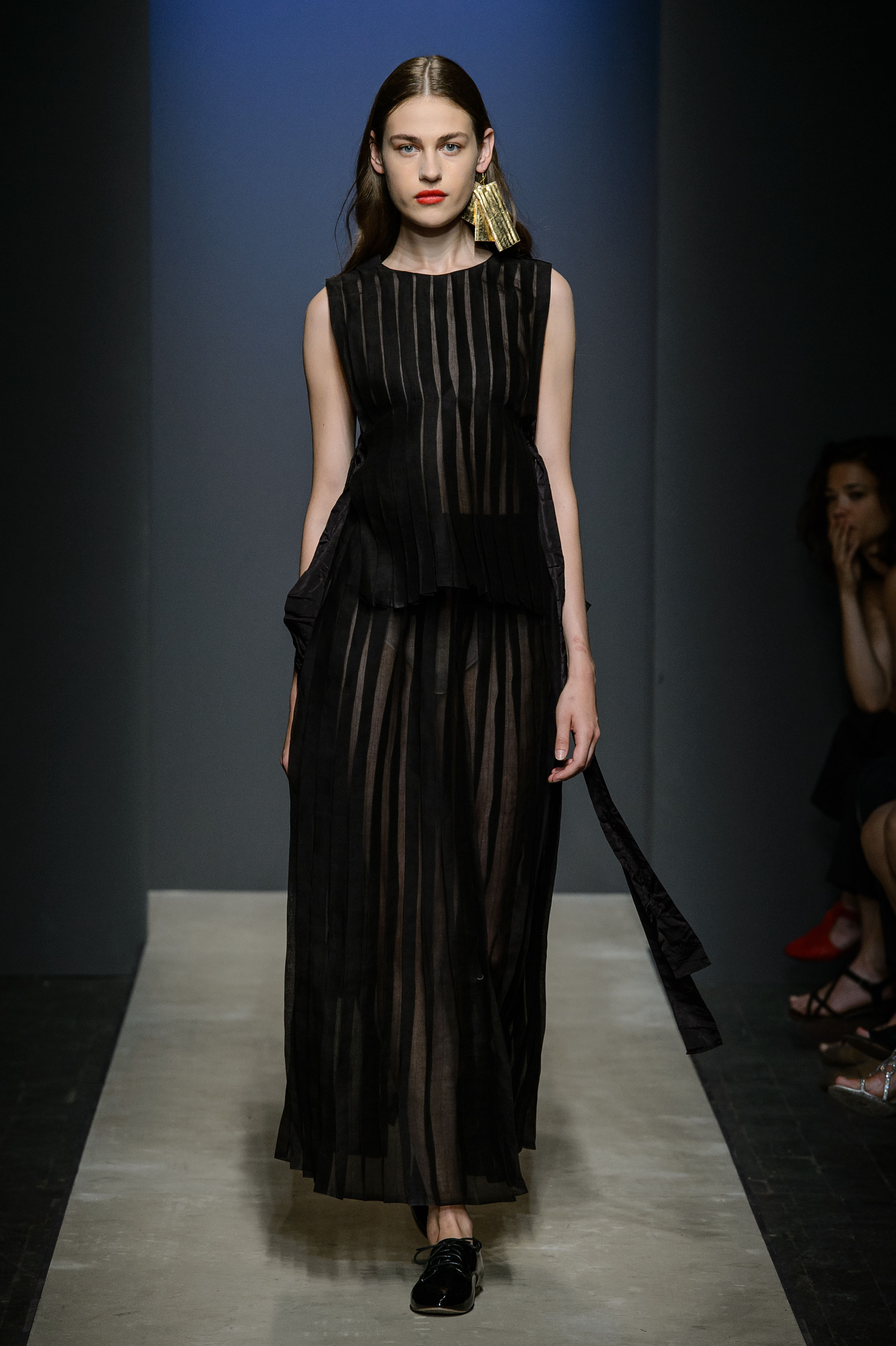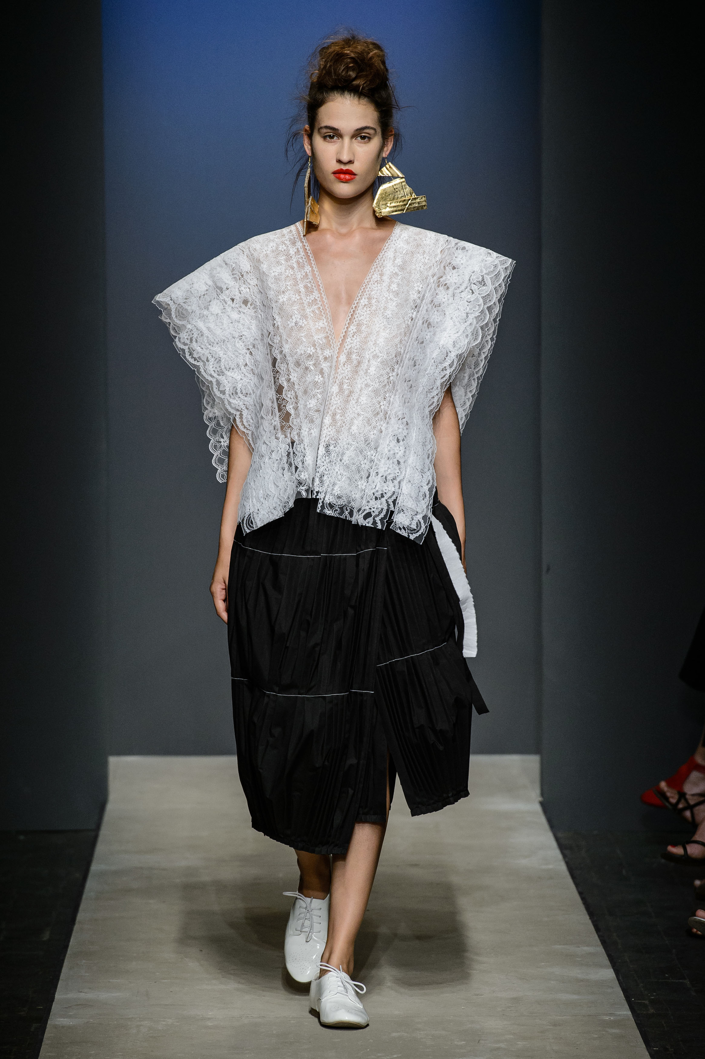Nasce a La Spezia conservatrice dei beni culturali, diviene stilista a Perugia, e, senza separare le proprie anime, racconta indosso alle proprie modelle lo stato dell’arte: è la giovane designer Sara Lanzi, prima protagonista della giornata di domenica, i cui abiti della collezione Talking to Sarita | SS 2017 si presentano al pubblico come emblema dell’ “abbozzo” artistico, di quanto, cioè, l’intenzione sia pezzo finito e quante, invece, siano le possibilità di un prosieguo. Una passerella in divenire, in cui il ruolo da protagonista spetta all’alternarsi tra bianco e nero, proprio come in un bozzetto di pittore, con qualche incursione dell’ecrù e blu, su silhouette morbide, abiti a balze, gonne lunghe a pieghe larghe, sottogonne di pizzo.