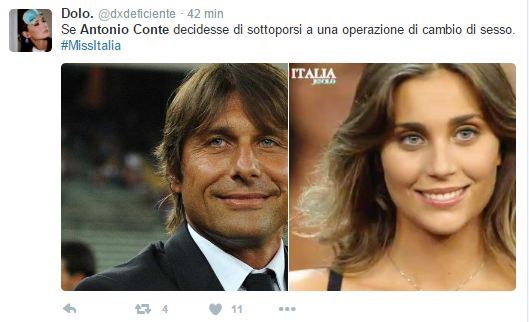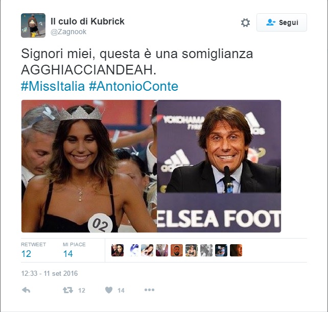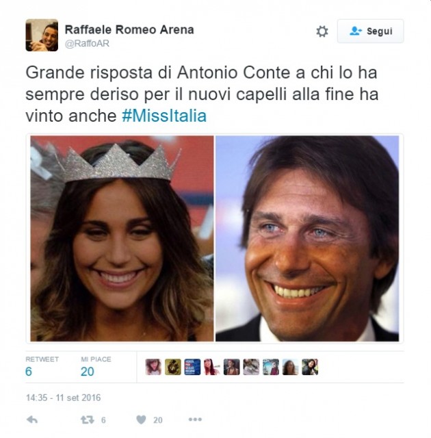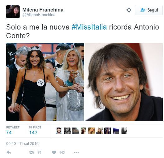 E’ Rachele Risaliti la nuova Miss Italia 2016 e come vuole la tradizione anche lei è ormai da giorni vittima i della rete. Nel mirino? la sua “agghiacciande” somiglianza con Antonio Conte. Il web è letteralmente impazzito per Rachele tanto da dar vita ad un’infinità sconfinata di “meme” che la mettono a confronto con l’ex allenatore della Juventus, oggi al Chelsea. La memoria sembra riportarci ad un anno fa quando la stessa sorte toccò ad Alice Sabatini. In quella occasione però la ragazza c’aveva messo del suo, sostenendo che l’anno in cui avrebbe preferito vivere fosse il 1942, in piena seconda guerra mondiale.