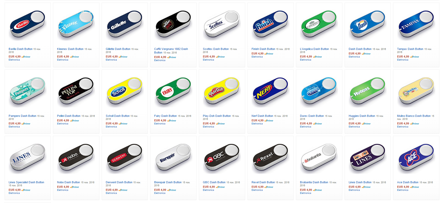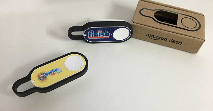Amazon Dash Button negli USA esiste già da un anno, ora è arrivato anche in Italia. Si tratta di un piccolo dispositivo connesso attraverso la rete wi-fi che consente l’acquisto di beni di uso comune premendo un semplice pulsante. C’è un Dash Button per ogni prodotto, da quello per il sapone, a quello per i pannolini o per i profilattici. Per essere sicuri di non restare senza il tuo prodotto preferito o semplicemente quello che utilizzi più in casa, basta selezionarlo al momento della configurazione del proprio Dash Button e quando sta per finire premere il pulsante. In 48 ore il tuo ordine verrà recapitato a casa, per evitare inconvenienti Dash Button ha un’impostazione secondo la quale finché l’ordine non è stato consegnato l’utente non può effettuarne un altro, indipendentemente dalle volte che si preme il pulsante. Lo stato dei propri ordini si può controllare sull’app di Amazon o direttamente sull’indicatore del dispositivo che, ad ordine avvenuto, diventa verde. Il costo di Dash Button è di 4,99euro, ma al momento del primo ordine Amazon regala ai propri utenti uno sconto pari al valore del dispositivo.