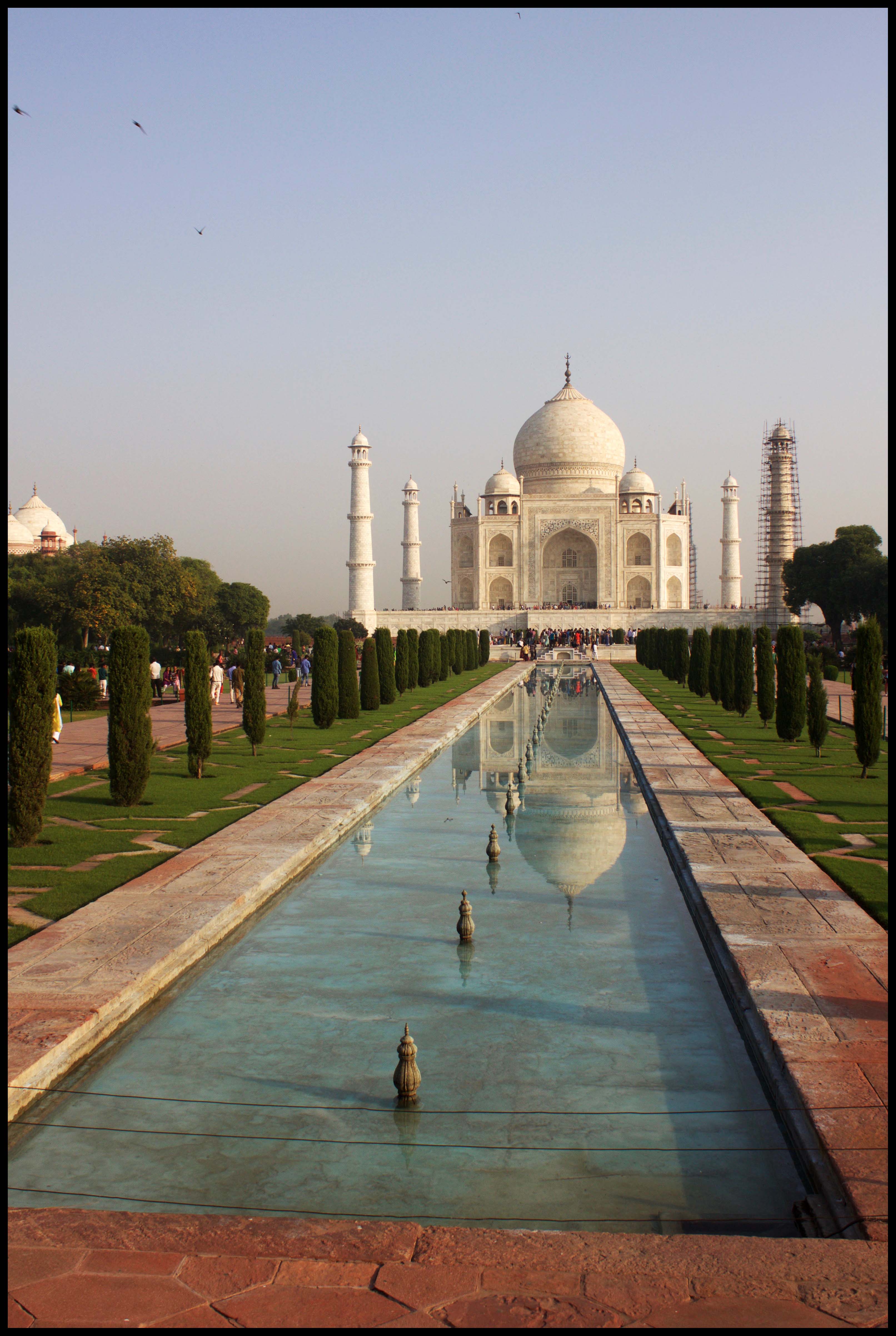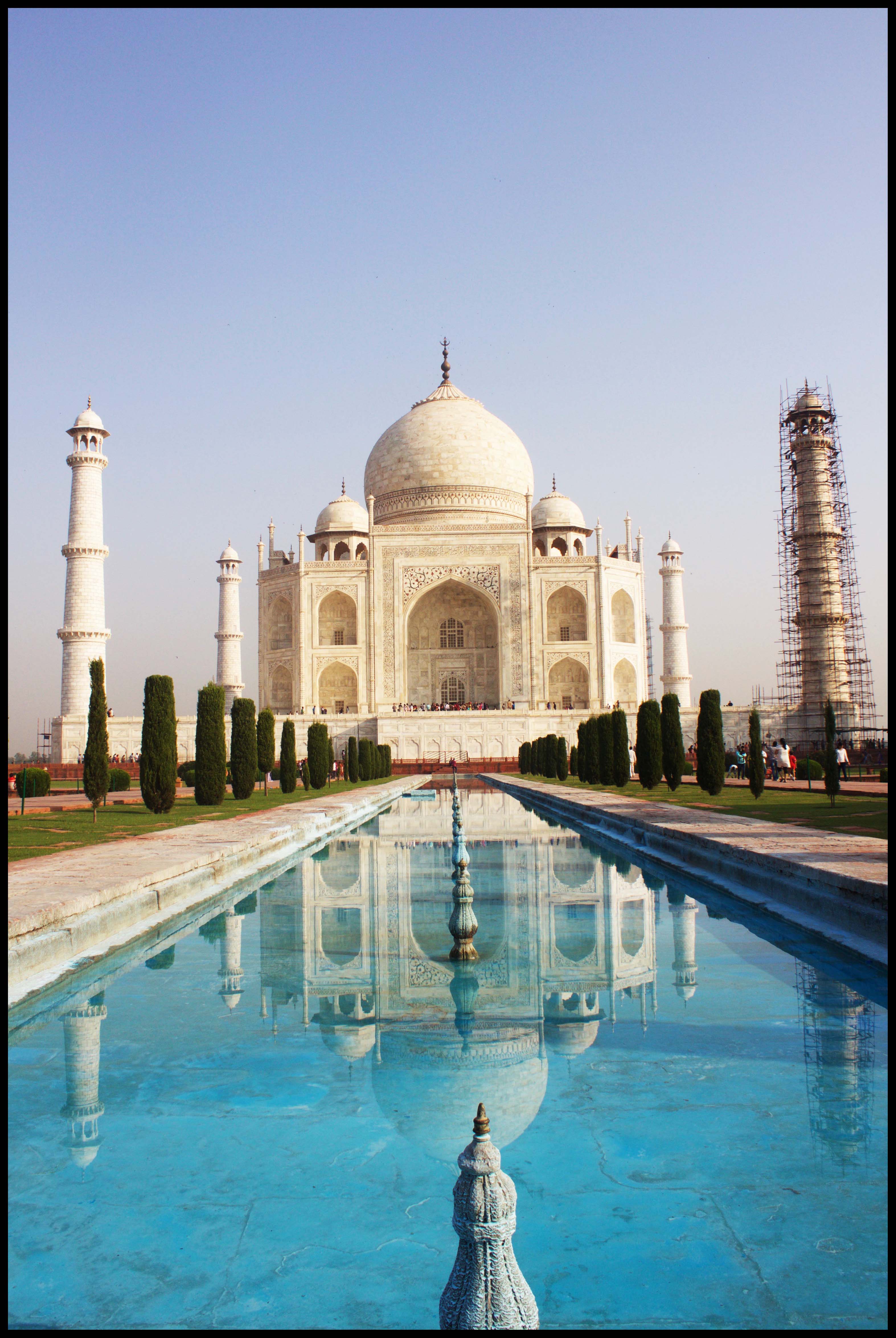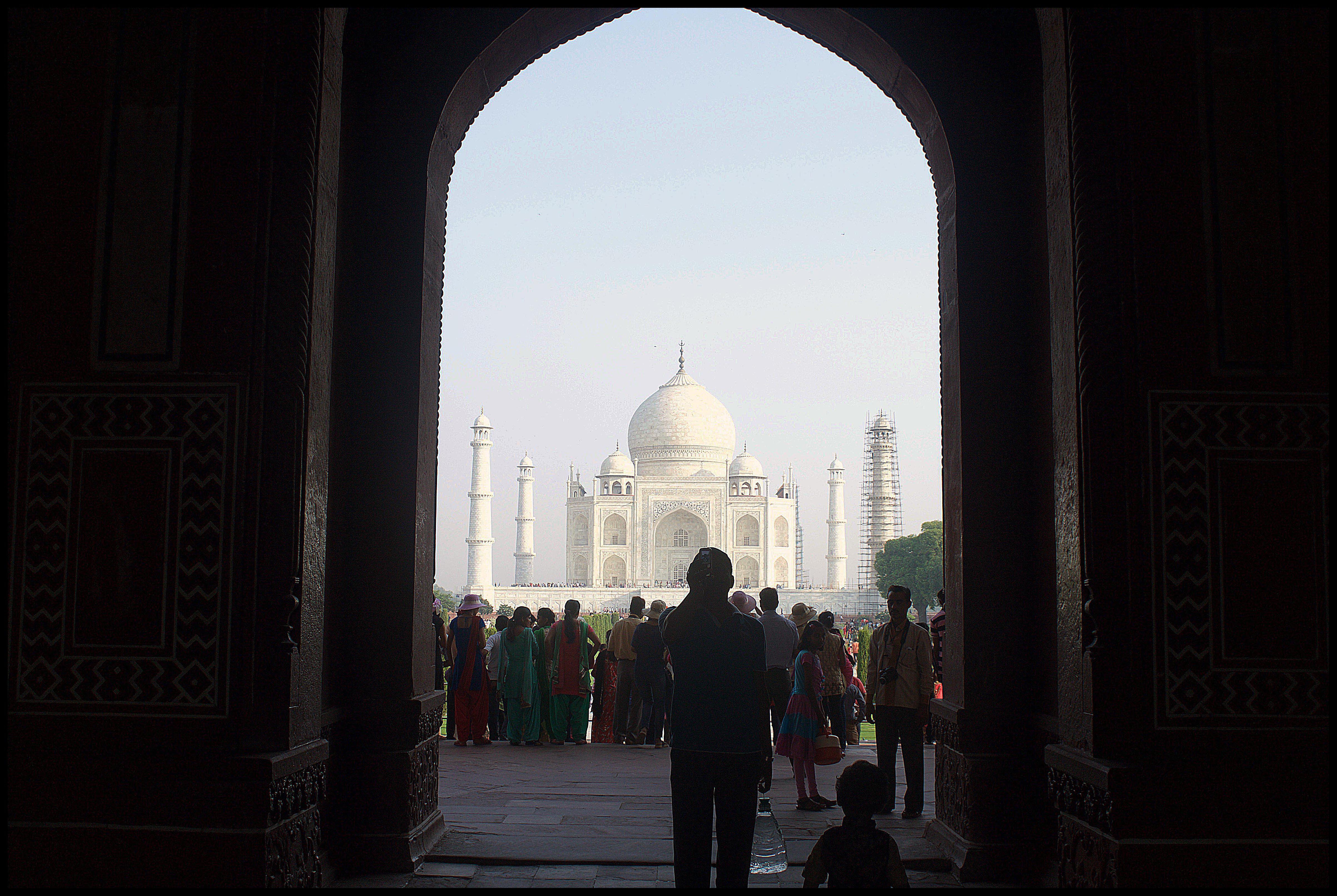 di turisti e viaggiatori formano lunghe code per visitare una delle sette meraviglie del mondo. Il momento migliore per ammirare il Taj Mahal è la mattina all’alba, prima dell’arrivo della folla quotidiana di visitatori. Alle prime luci del giorno il più grande monumento all’amore appare avvolto come da un’aura magica. Al Taj Mahal si può accedere tramite diversi ingressi; arrivando da sud l’edificio appare incastonato oltre un gigantesco arco, come una visione rubata dal buco di una serratura. La sensazione di irrealtà che lo circonda non svanisce avvicinandosi, costeggiando l’iconico viale dalle vasche longilinee: sarà forse merito dell’intensa luce della canicola indiana presente tutto l’anno, complice di far risaltare il marmo bianco del Taj Mahal tanto da far sembrare la sua bellezza sempre eterea, inarrivabile, irraggiungibile.
