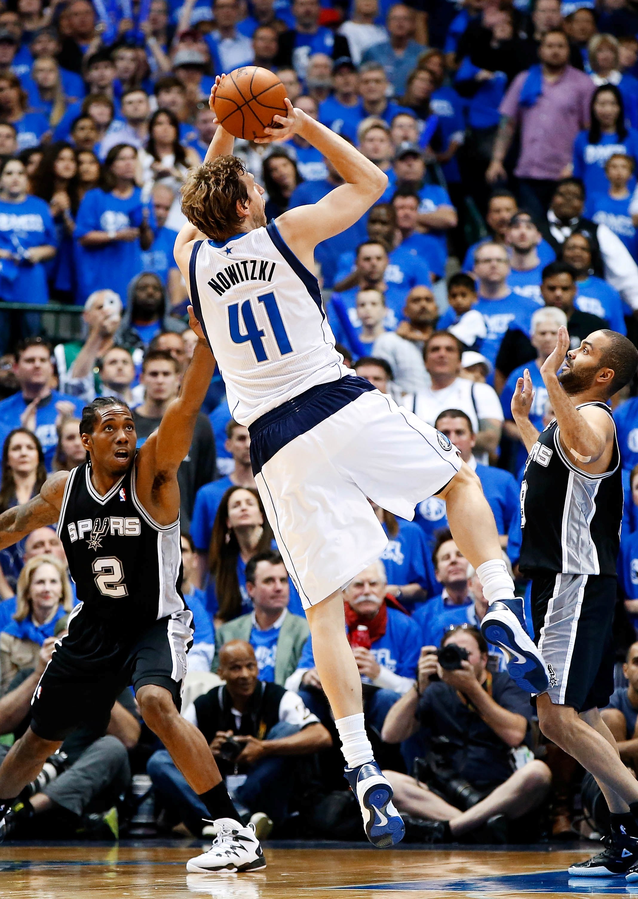 IL FADE AWAY LEGGENDARIO – Ogni giocatore ha un marchio di fabbrica. Un movimento o una capacità che lo rende unico e speciale rispetto a tutti gli altri. Kareem aveva il gancio cielo. Shaq ha portato lo Shaq attaq. Jordan la famosa schiacciata con le gambe larghe e la lingua di fuori. Nowitzki verrò ricordato per il suo fade away. Il fade away è, letteralmente, un tiro cadendo lontano. Ci si stacca dal difensore e si tira buttandosi con il corpo lontano dal canestro per evitare la stoppata. Un movimento difficile il fade away. Ecco, quello di Nowitzki è il suo marchio di fabbrica. Dirk parte spalle a canestro, con il corpo si appoggia sul difensore, ne percepisce la posizione, poi dopo una finta o due di giro dorsale, si butta indietro con il corpo, proteggendosi con il ginocchio alto e lascia andare la palla da un altezza di quasi 3 metri. Non esiste giocatore al mondo in grado di marcare quel movimento. Quello è il SUO tiro.