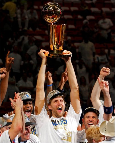 GIASONE E IL VELLO D’ORO – Passano gli anni e nonostante i Mavs siano sempre una delle squadre più forti della lega, fioccano le delusioni. Ai playoffs non si riesce a passare il secondo turno e nel roster manca sempre qualcosa. Nel 2008, per sopperire alla carenza di regia, Cuban decide di puntare sul ritorno di Jason Kidd, play dalla straordinarie doti di passatore che ai Nets ha scritto pagine di grande basket. Si arriva così alla famigerata stagione del riscatto. 2011. Davanti, in quello che sembra un amaro scherzo del destino, ci sono ancora una volta i Miami Heat. Stavolta però non c’è più Shaq, ma insieme a Wade ci sono LeBron e Bosh, i Big Three. Portland, Lakers e Thunder non sono riusciti a fermare la corsa dei texani, che ora hanno lo scoglio più grande da superare, la storia. Se esiste una gara in grado di raccontare la carriera di un giocatore, questa è senza dubbio gara quattro dei playoffs contro Miami. Nowitzki ha 39 di febbre. Non si regge in piedi. Sbaglia 10 tiri da tre su 11, e addirittura un tiro libero, mentre i tifosi degli Heat lo prendono in giro per la canzoncina che canta durante il suo rilascio per darsi il ritmo. Sembra che nulla possa salvare Dallas da un sicuro 1-3 e da un’altra sconfitta in finale contro gli stessi avversari. Invece qualcosa scatta. Nowitzki decide che è il momento di entrare nel libro delle imprese eroiche della NBA, e nell’ultimo quarto piazza 10 punti. Non si tiene in piedi ma lotta, va in post, sfodera il suo leggendario Fade away. I Mavs rimontano e vincono 86 – 83. Questa volta l’inerzia è tutta dalla parte dei texani. Barea sembra Speedy Gonzales e semina il panico nelle fila avversarie, Kidd dispensa assist e gioco, Terry punisce ogni raddoppio su Nowitzki. Shawn Marion mette la museruola a LeBron. Dallas è una macchina da guerra. Nelle due partite restanti non c’è storia, i texani si impongono per 4-2. La maledizione è spezzata, Nowitzki vince il premio di MVP delle finali e diventa finalmente campione NBA.