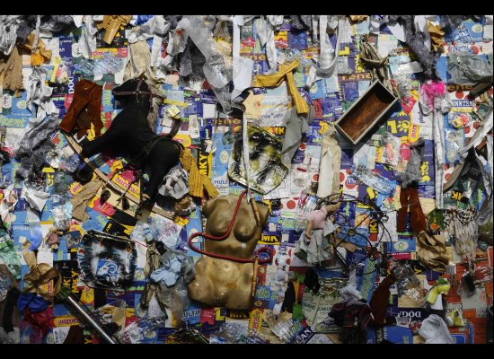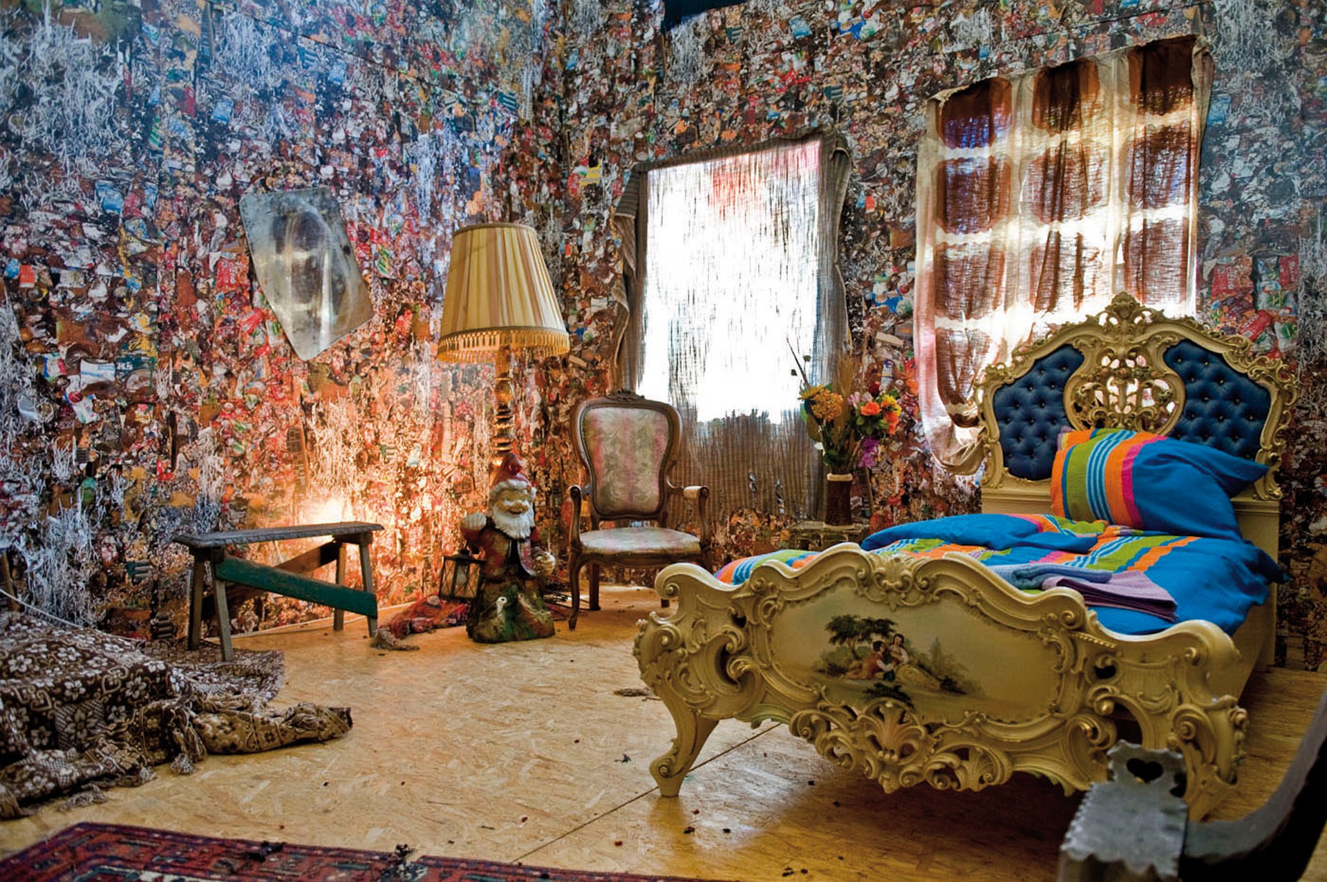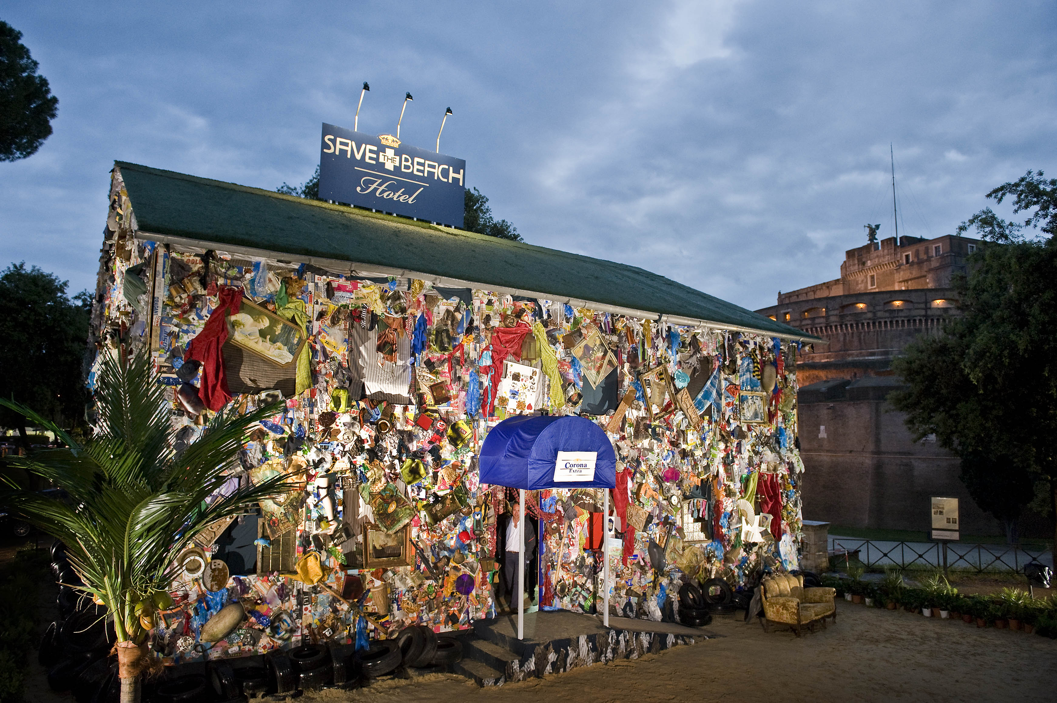 Fogli di giornale: a proposito di costruzioni riciclate le pareti interne ed esterne dell’Hotel Garbage di Madrid sono tappezzate di fogli di giornale e tessuti. Per ornarle ulteriormente, qua e là l’artista, Ha Schult, ha applicato diversi oggetti raccolti sulle spiagge: bicchieri di plastica, valigie, buste e finanche un manichino. Rappresenterebbe un monito a rispettare di più l’ambiente, tenendo pulite le spiagge.