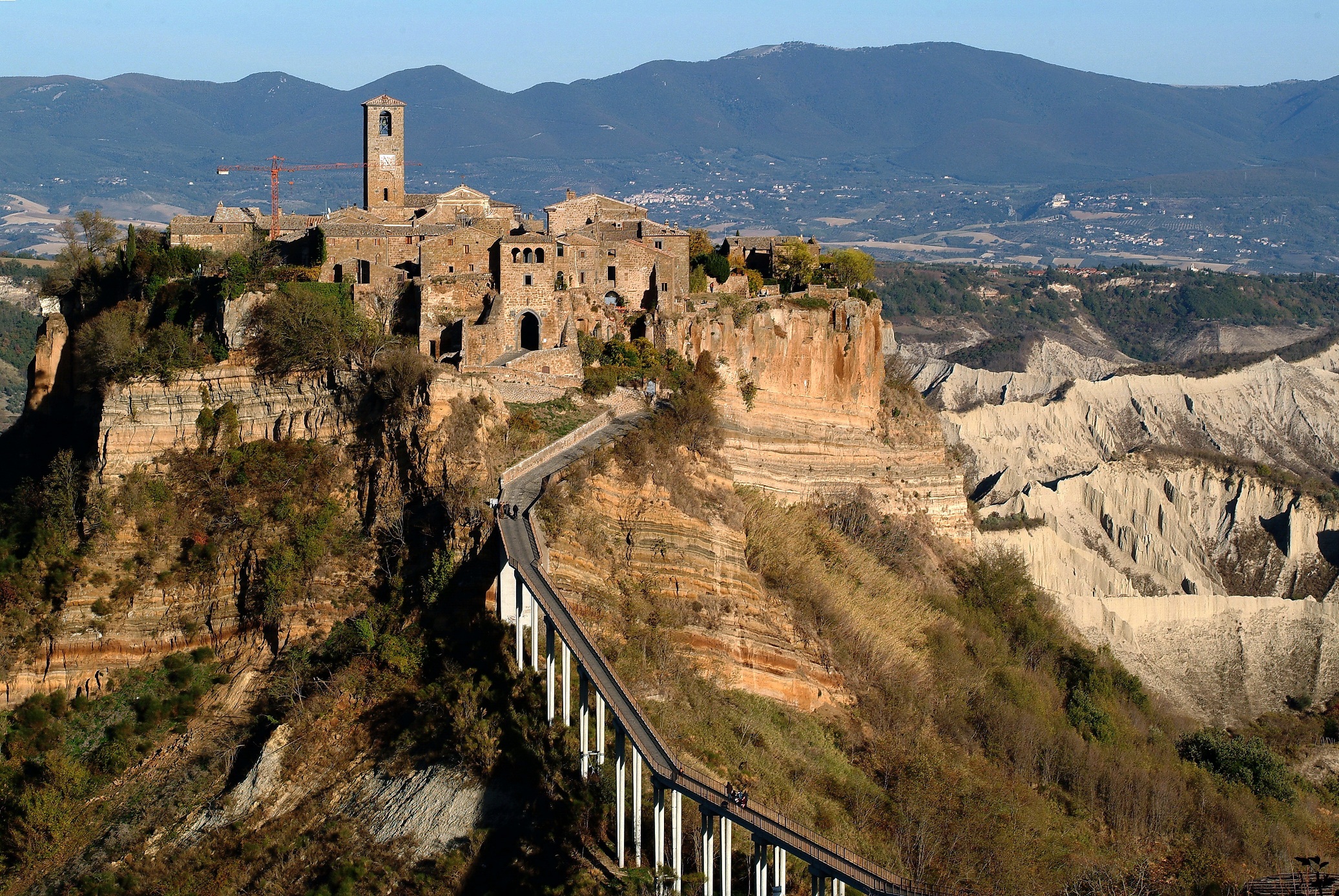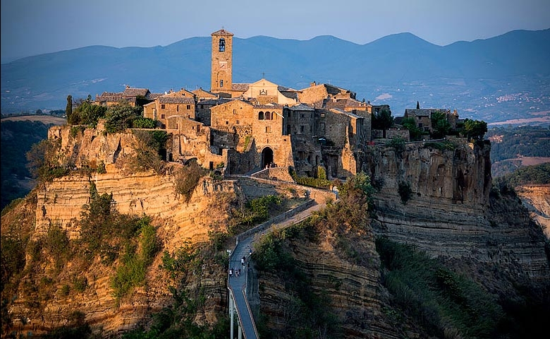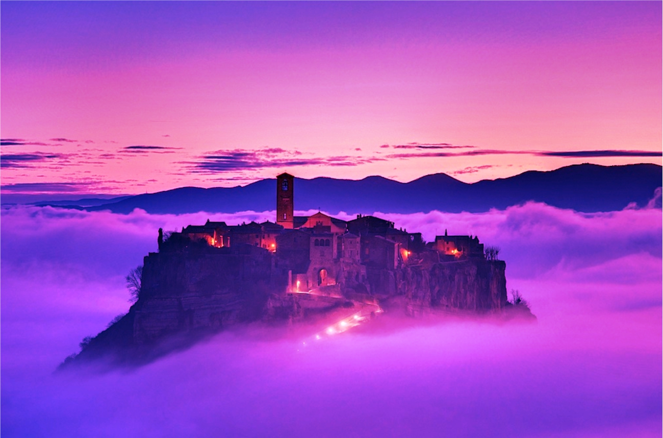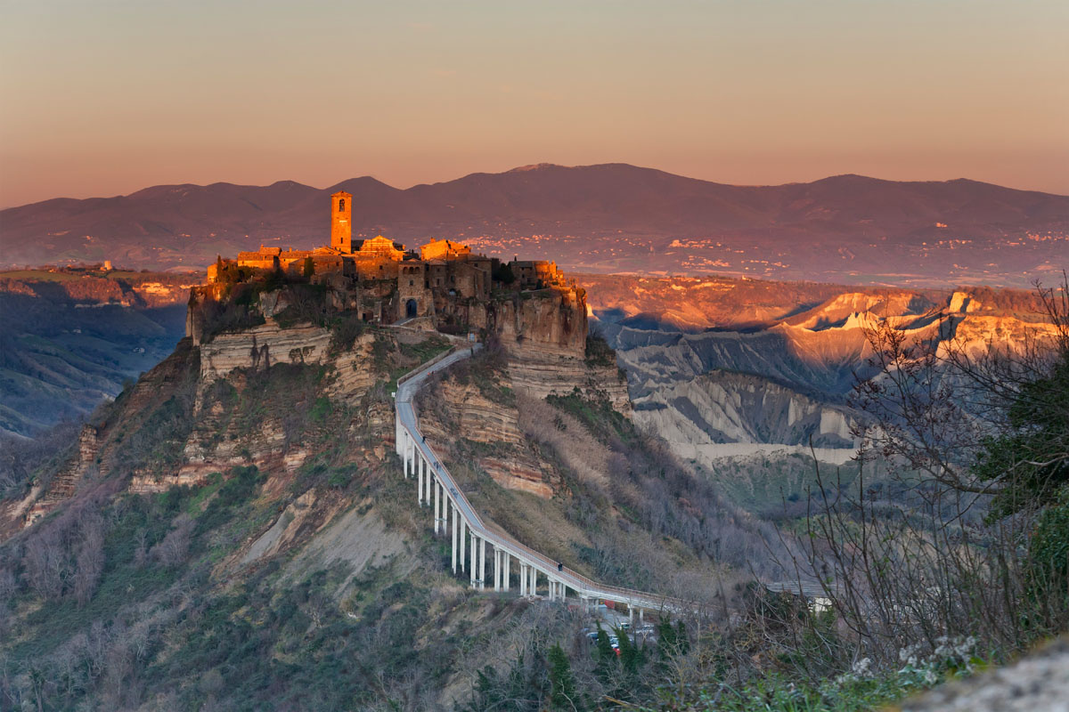 Situata al confine con l’Umbria, Civita di Bagnoregio, gioiello unico al mondo, considerato uno dei borghi più belli d’Italia, è soprannominata la “città che muore”, proprio per il suo destino lento ed inesorabile che l’ha condannata all’erosione. Civita di Bagnoregio è un borgo “sospeso” tra il cielo e la terra: si erge sul cocuzzolo della montagna, a picco su un immenso territorio circostante ed è collegata al resto del mondo, da un sottilissimo e lunghissimo viadotto in cemento.