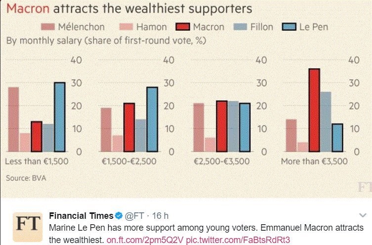 Queste motivazioni portano il cittadino medio, quello che vanti più di 2000 euro sulla propria busta paga mensile, a preferire Macron a Le Pen. Non tanto perchè convinti dalla linea politico economica tratteggiata dal primo durante i mesi di campagna elettorale (ne parlaremo tra poco), ma perchè terrorizzati, per farla breve, dal pericolo dell’instaurazione di un nuovo fascismo, in quel paese che è considerato la culla dell’Europa per valori e principi (non dell’UE ndr.)