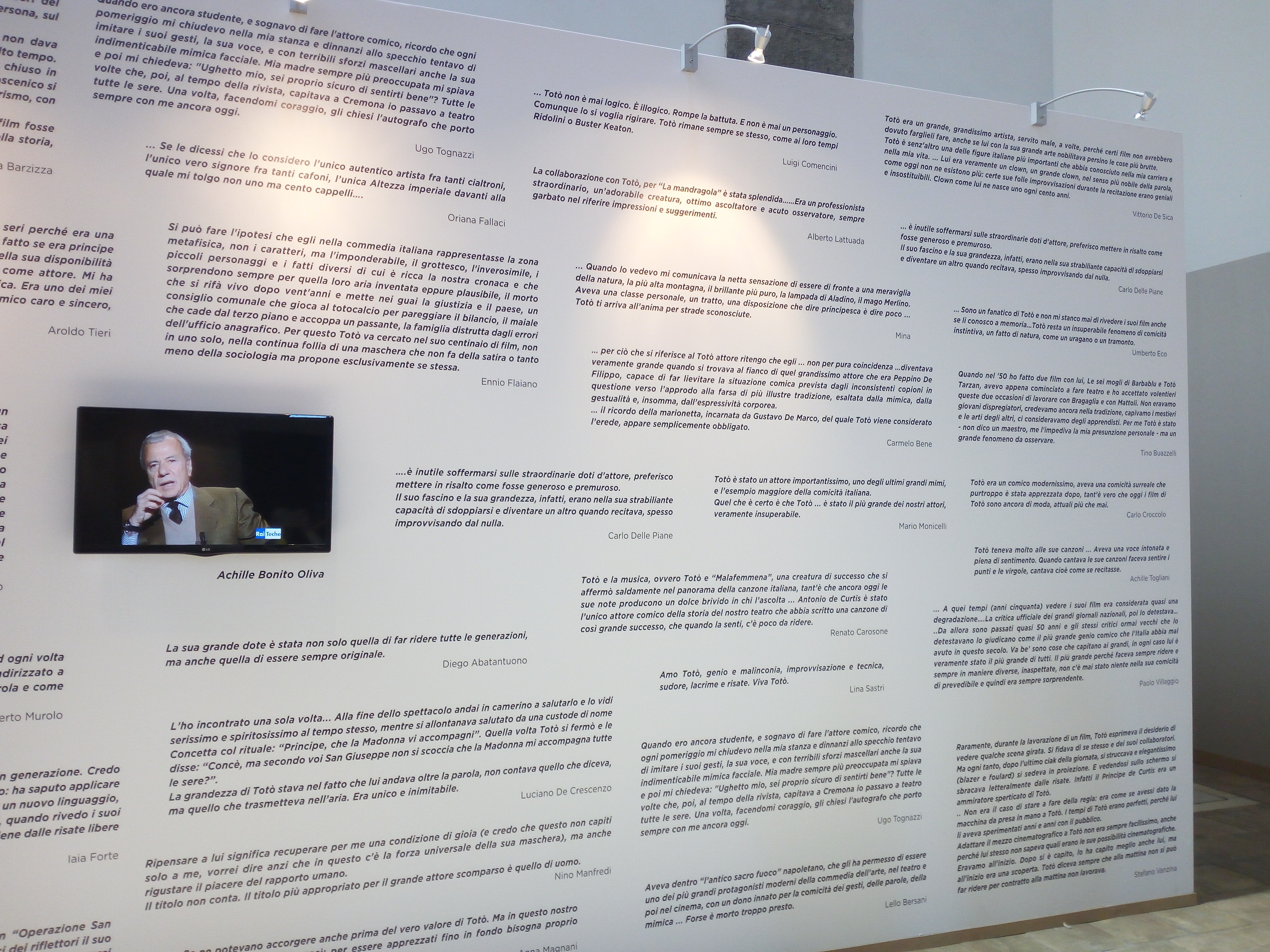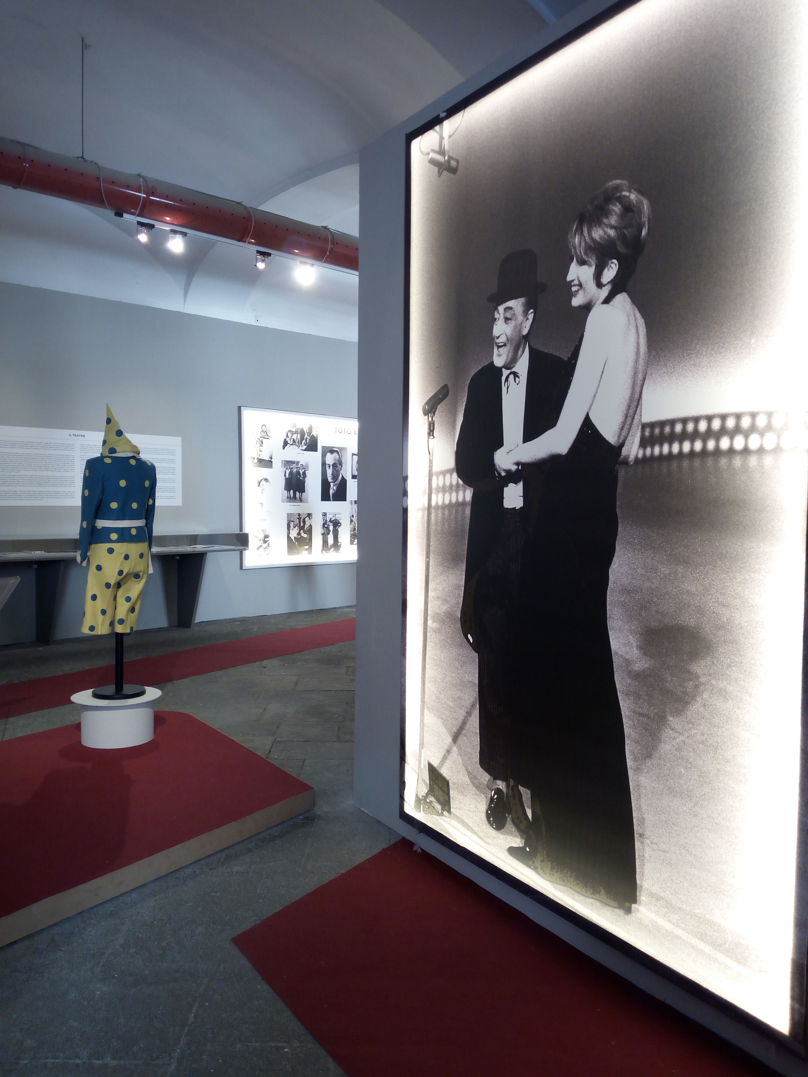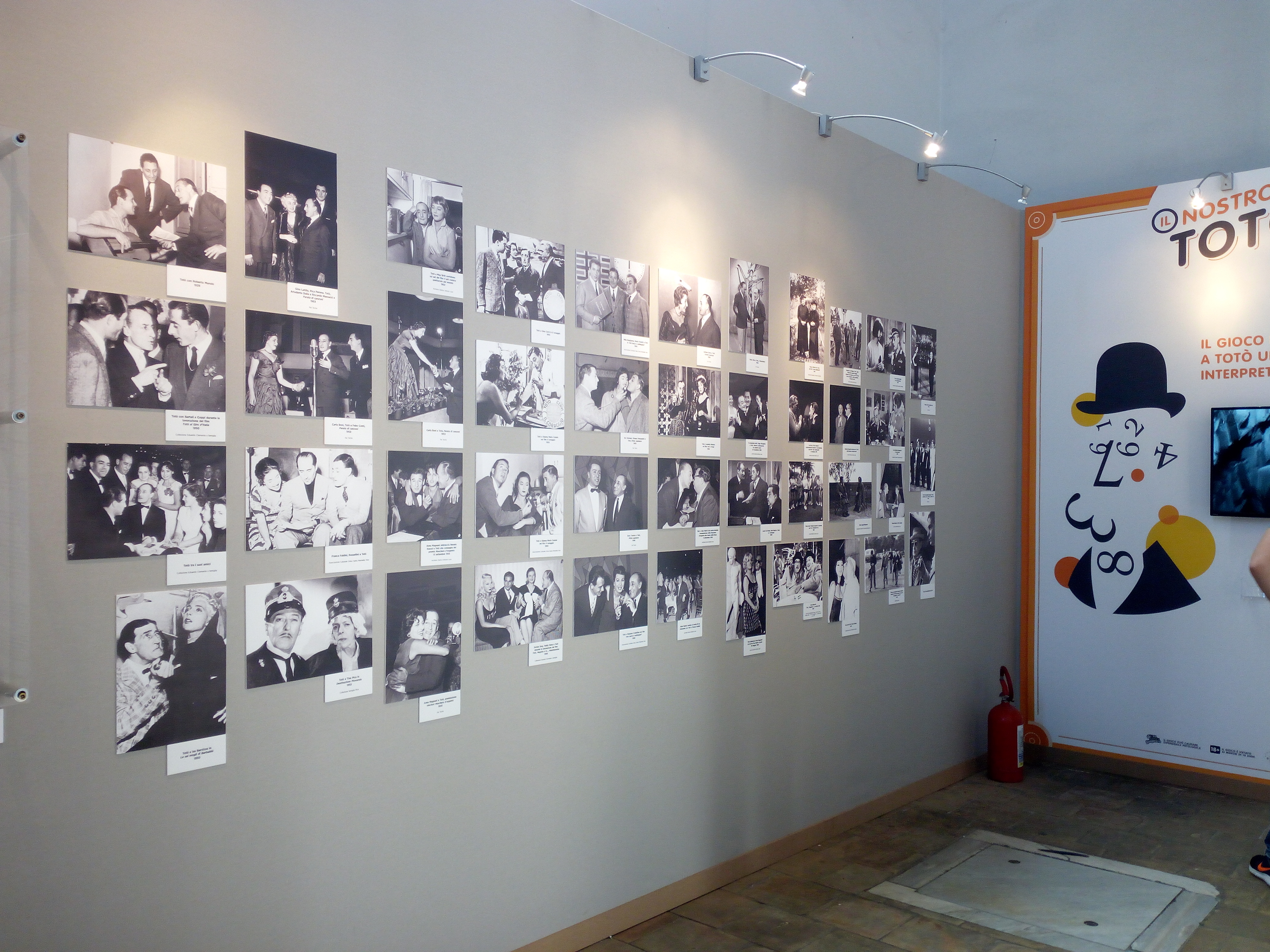 Inaugurata a Napoli l’11 aprile, la mostra si disloca in diversi punti della città di Napoli: cuore pulsante è la Sala Dorica di Palazzo Reale, che ospita una prima parte della mostra, Totò che spettacolo! Qui potrete ammirare i costumi originali indossati nei diversi film: chi non ricorda il famoso costume da ufficiale romano indossato in Totò e Cleopatra o quello ispirato al burattino Pinocchio, indossato in Totò a colori? Da qui si passa agli oggetti personali del grande attore: i trucchi utilizzati sul set, lo specchio, gli occhiali, la famosa bombetta nera; mentre uno spazio speciale è lasciato al frac nero e al baule, che hanno accompagnato il principe della risata in gran parte dei set cinematografici. Sempre nella stessa sede sono raccolti alcuni autografi dell’attore stesso, che vanno da semplici appunti a vere e proprie poesie, nonché diversi spartiti, tra cui quello di ‘Malafemmena’. “Non c’è nessuna discrepanza tra la mia professione e il fatto che io componga canzoni e butti già qualche verso pieno di malinconia. Sono napoletano e i napoletani sono bravissimi nel passare dal riso al pianto” diceva Totò. Le Teche Rai e l’Istituto Luce, che hanno collaborato insieme alla Cor per la buona riuscita della mostra, hanno frugato nei loro archivi ed allestito delle piccole sale in cui è possibile fruire filmati originali. Di grande effetto le gigantografie che ritraggono il grande Totò.