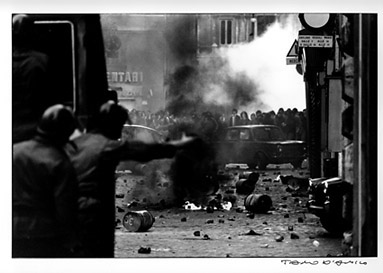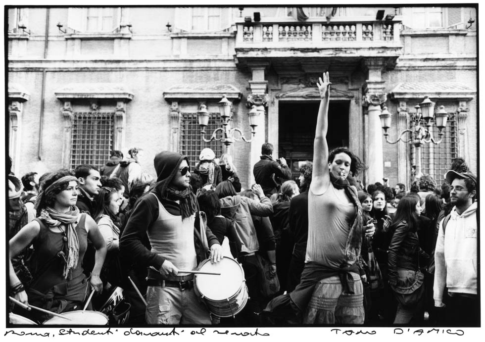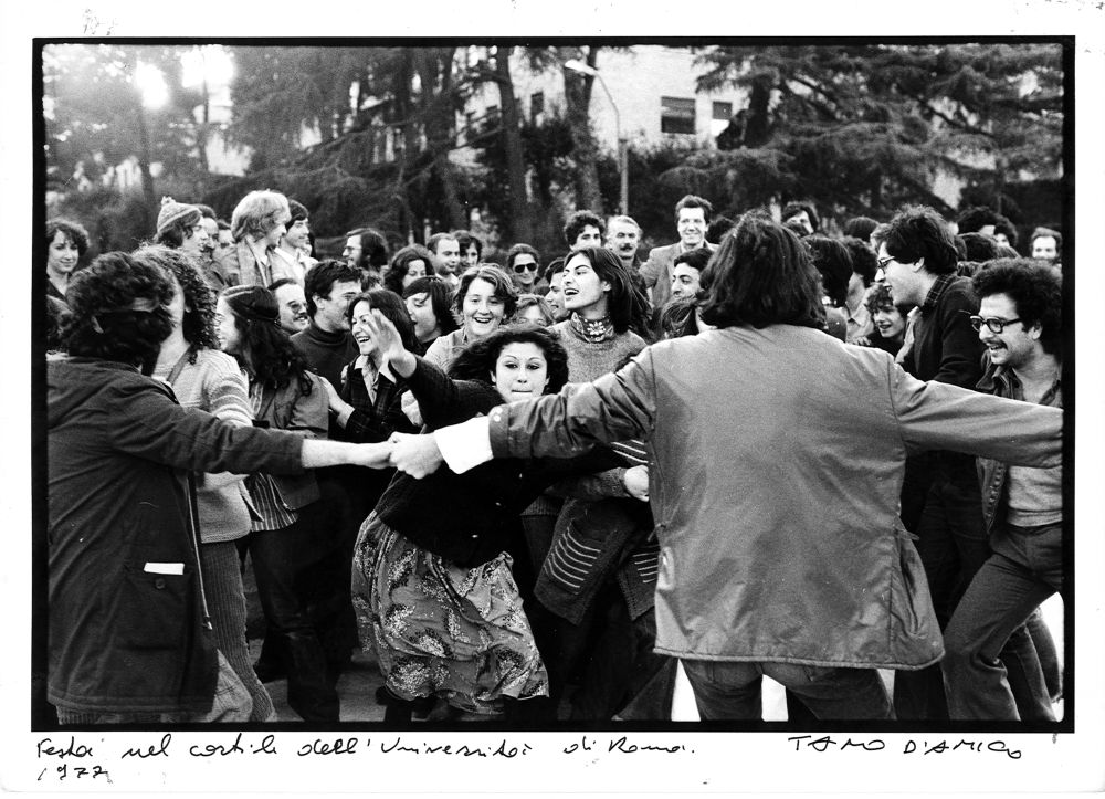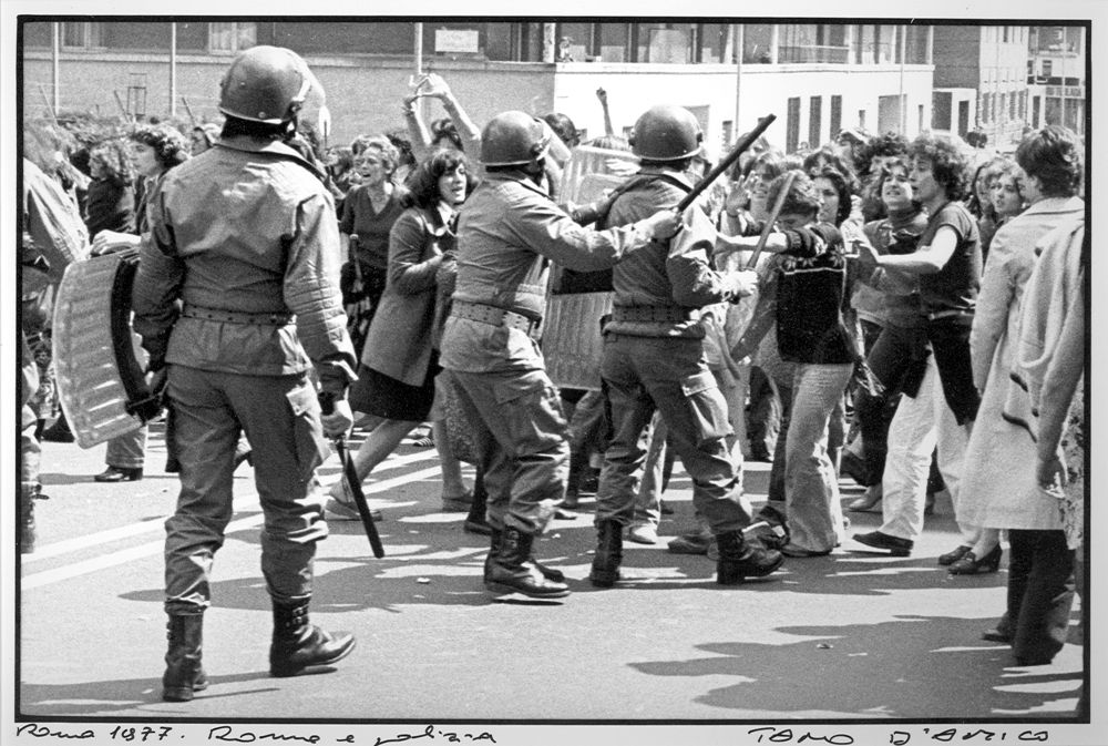 Nel 1977 in Italia terminarono ufficialmente le trasmissioni di Carosello, prese il via il processo per la strage di Piazza Fontana e fu approvata la legge sull’aborto, ma soprattutto il 1977 vide nascere il cosiddetto Movimento del ‘77, un’organizzazione politica spontanea, formatasi principalmente nell’area di gruppi della sinistra extraparlamentare e caratterizzata dalla dichiarata contestazione al sistema dei partiti e dei sindacati, da una componente fortemente creativa e da nuove istanze fino ad allora inedite come le urgenze femministe e la difesa dei diritti umani e civili. Il movimento coinvolse vasti strati delle periferie degradate che vivevano la loro condizione sottoproletaria ai margini della società e della politica nazionale: operai, ma anche giovani che da pochi anni avevano cominciato a frequentare le università pubbliche, non più appannaggio delle sole classi borghesi. In quell’anno caldo le principali città italiane come Roma, Bologna e Torino furono teatro di violenti scontri di piazza in cui rimasero uccisi militanti, studenti e poliziotti, infiammando ancor di più un clima politico e culturale già fortemente infocato, momenti immortalati dai fotoreporter e divenuti emblematici di una generazione che rivendicava con forza diritti basilari. Al Museo di Roma in Trastevere fino al prossimo 14 gennaio la mostra ’77 una storia di quarant’anni fa nei lavori di Tano D’Amico e Pablo Echaurren, ripercorre i fatti e gli eventi accaduti in quell’anno attraverso le immagini fotografiche del giornalista e fotoreporter Tano D’Amico che seguì da vicino il movimento studentesco e operaio in tutto il suo percorso, e le opere grafiche dell’artista Pablo Echaurren.