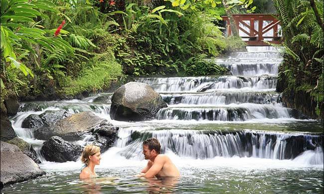 Tabacon è situato su più di 900 acri di lussureggiante riserva tropicale, sede della più grande rete di sorgenti calde naturali del Costa Rica. Offre 103 lussuose camere e suite; due ristoranti; quattro bar e una spa di livello mondiale. Ci sono cinque sorgenti principali di acqua altamente mineralizzata che viene riscaldata sottoterra dal magma del vulcano Arenal. L’acqua termale scorre in tutto il resort, formando il fiume Tabacon. Troverete decine di cascate e piscine calde lungo il letto del fiume, di diverse temperature e intensità di flussi d’acqua. Alcune vasche sono vaste e calme, altre sono piccole e offrono privacy a chi desidera scomparire in un angolo appartato. Per coloro che richiedono un’angolo rinfrescante, Tabacon offre una piscina di acqua fredda, a solo un paio di minuti a piedi, nella fitta foresta pluviale. L’area principale per prendere il sole e nuotare offre cinque piscine, un bar sull’acqua e lo scivolo termale. Le temperature della piscina fluviale vanno da 72 a 105 gradi Fahrenheit. Durante il loro soggiorno, gli ospiti di Tabacon durante la notte ricevono un accesso gratuito e illimitato al fiume termale e alle sue piscine.