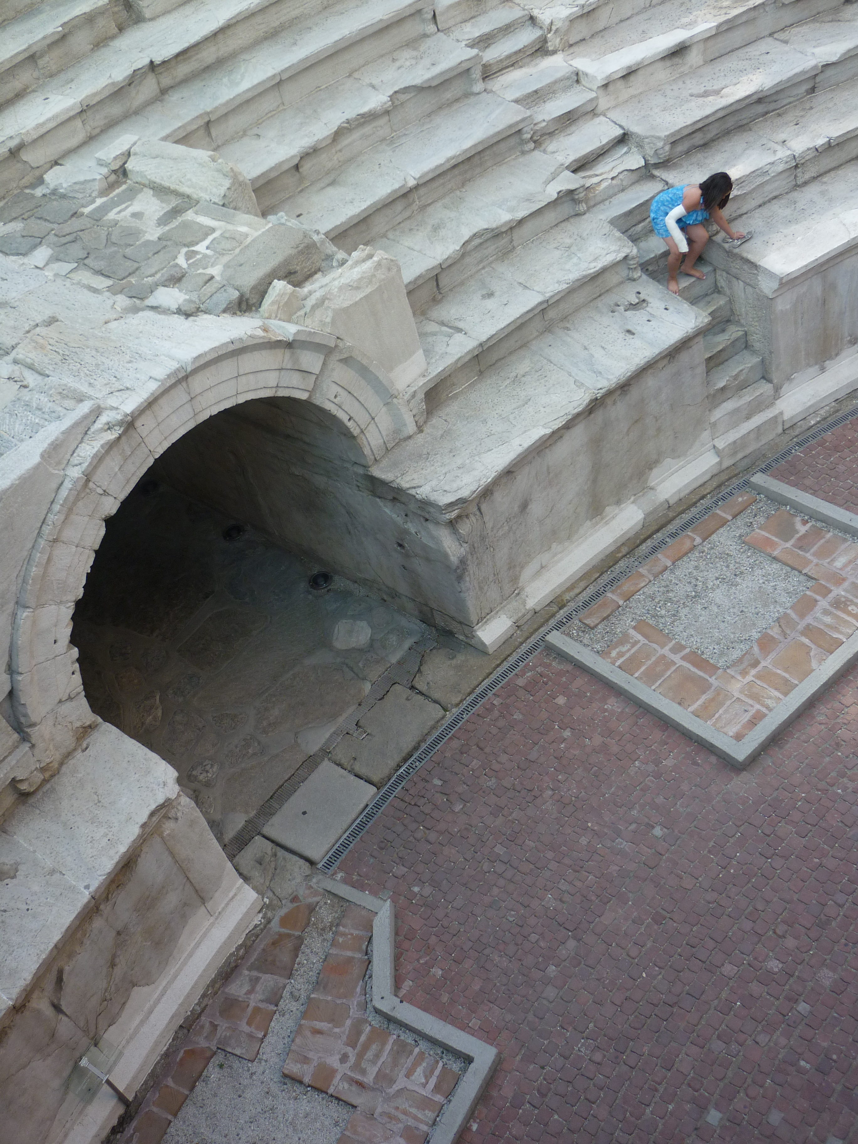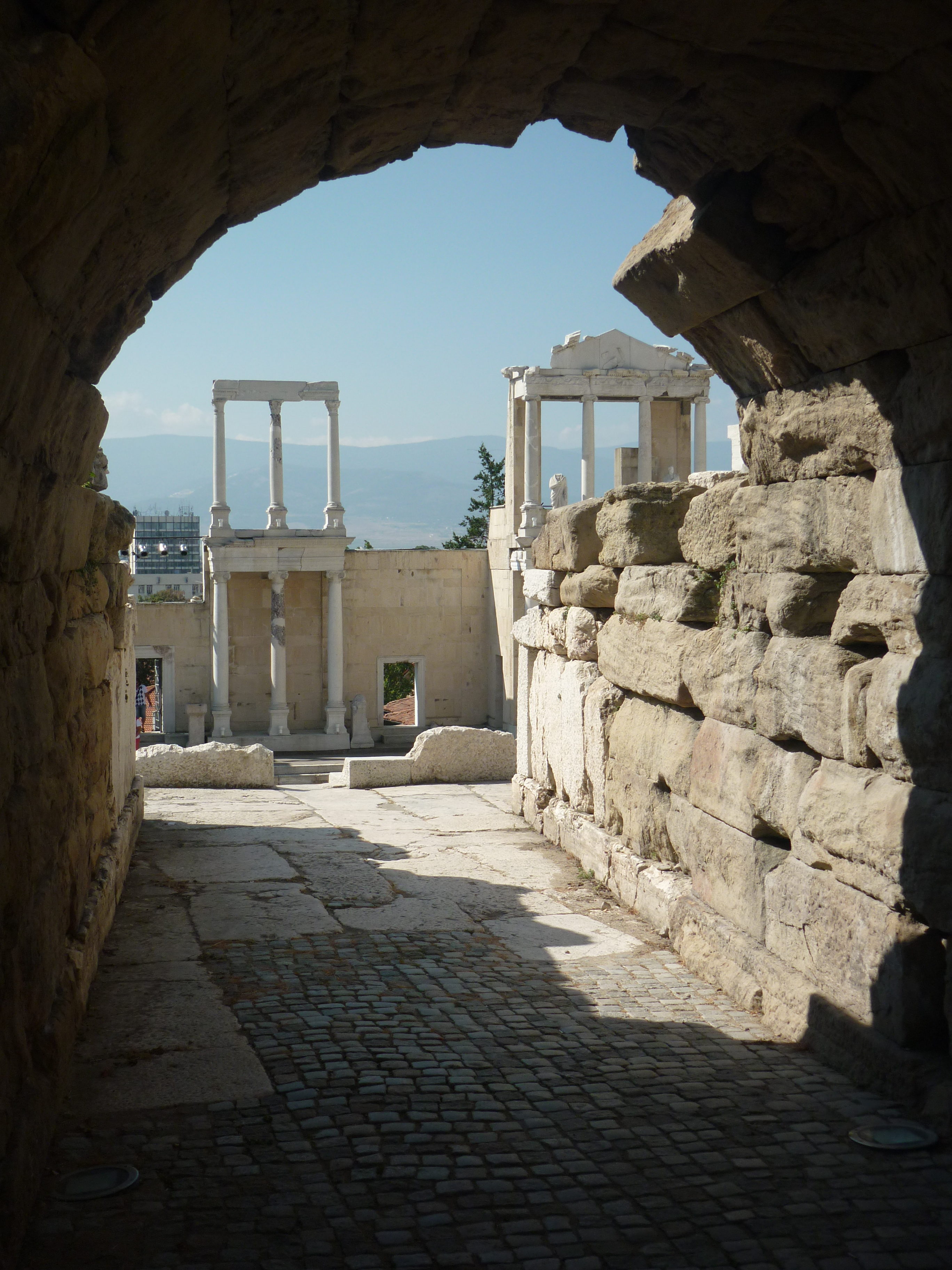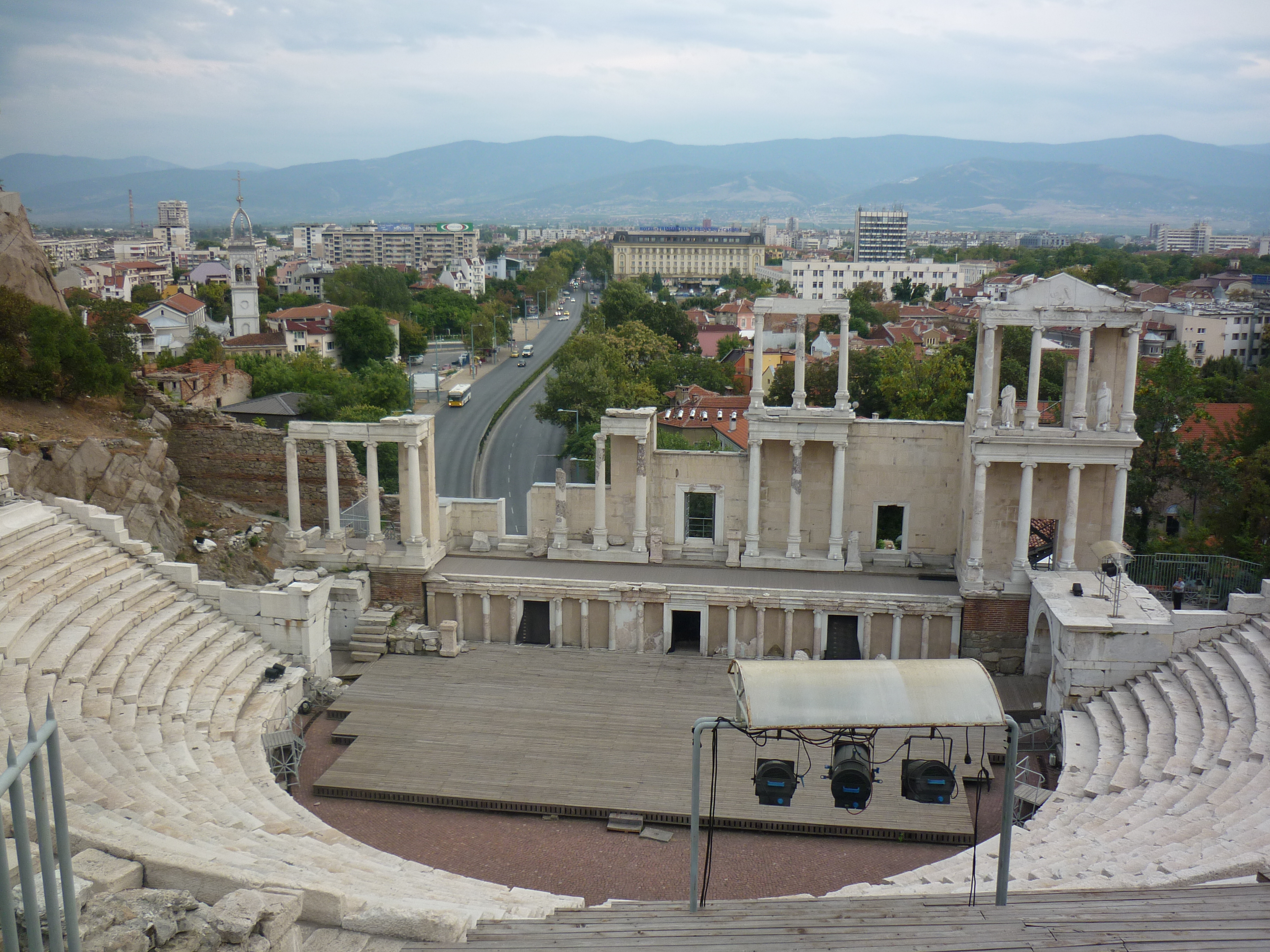E’ tempo di avanzare. Tappa consigliata, Veliko Tarnovo, l’antica capitale degli Zar Bulgari, con le vie acciottolate e le case in legno a graticcio, i grandi alberi ombrosi di foglie larghe; vera essenza di esprit dei Balcani del sud, che qui si chiamano Stara Planina e sono famosi per la coltivazione delle rose. Di Plovdiv, nel 2019 capitale europea della cultura insieme a Matera, i nostri tiggì hanno sottolineato in genere che è poco conosciuta e -tanto per cambiare- misteriosa. E infatti fa un certo effetto sedersi nel grande anfiteatro romano –siamo nell’antica Tracia conquistata da Traiano- che ricorda un po’ quello di Taormina; però tra gli archi della scena non c’è il mare ma una grande arteria urbana, che si infila lì sotto.